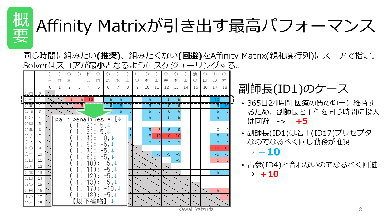 これらを数値としてモデル化し、必須条件以外の日でも「ベストな配置」になるよう最適化します。