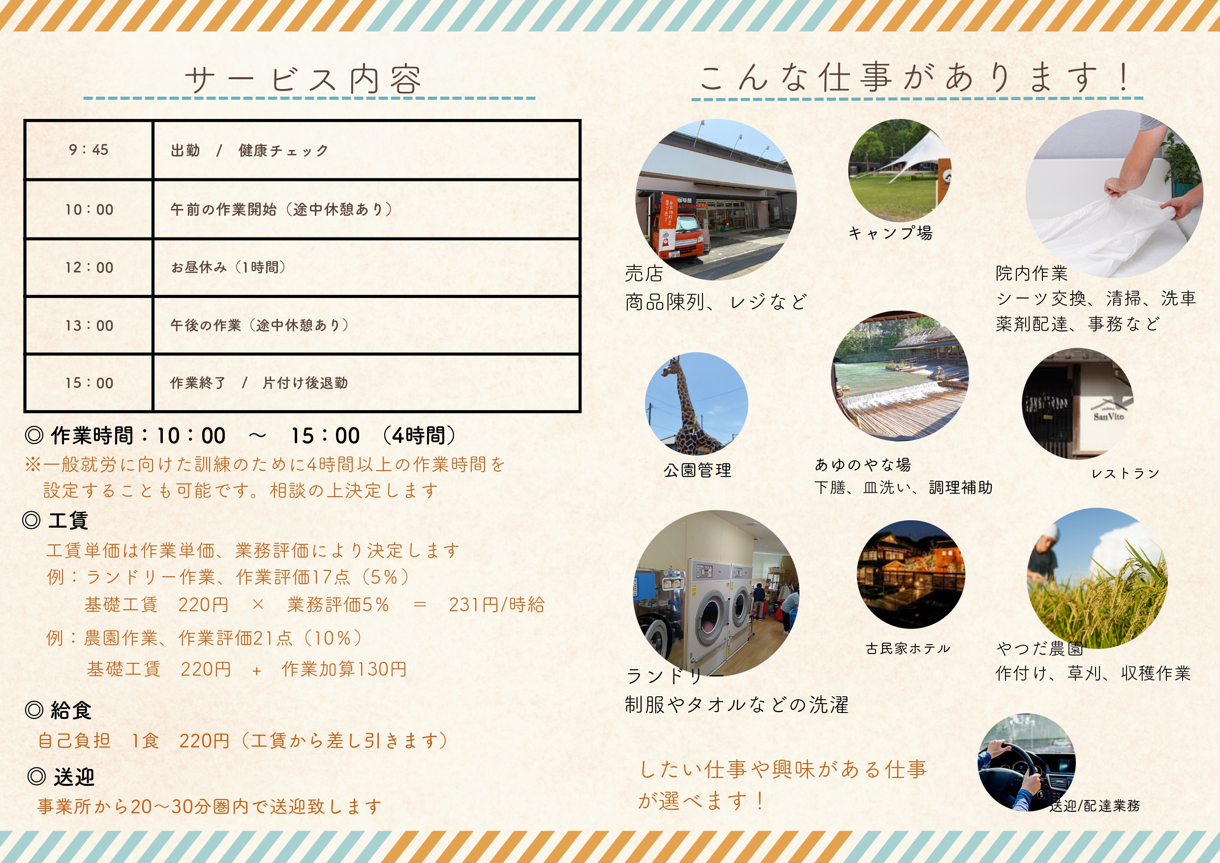 デスクワーク、農業、ランドリー、飲食、売店など、さまざまな仕事の中から、まずは「興味のあること」「やってみたいこと」を選んでもらうスタイルを大切にしています。